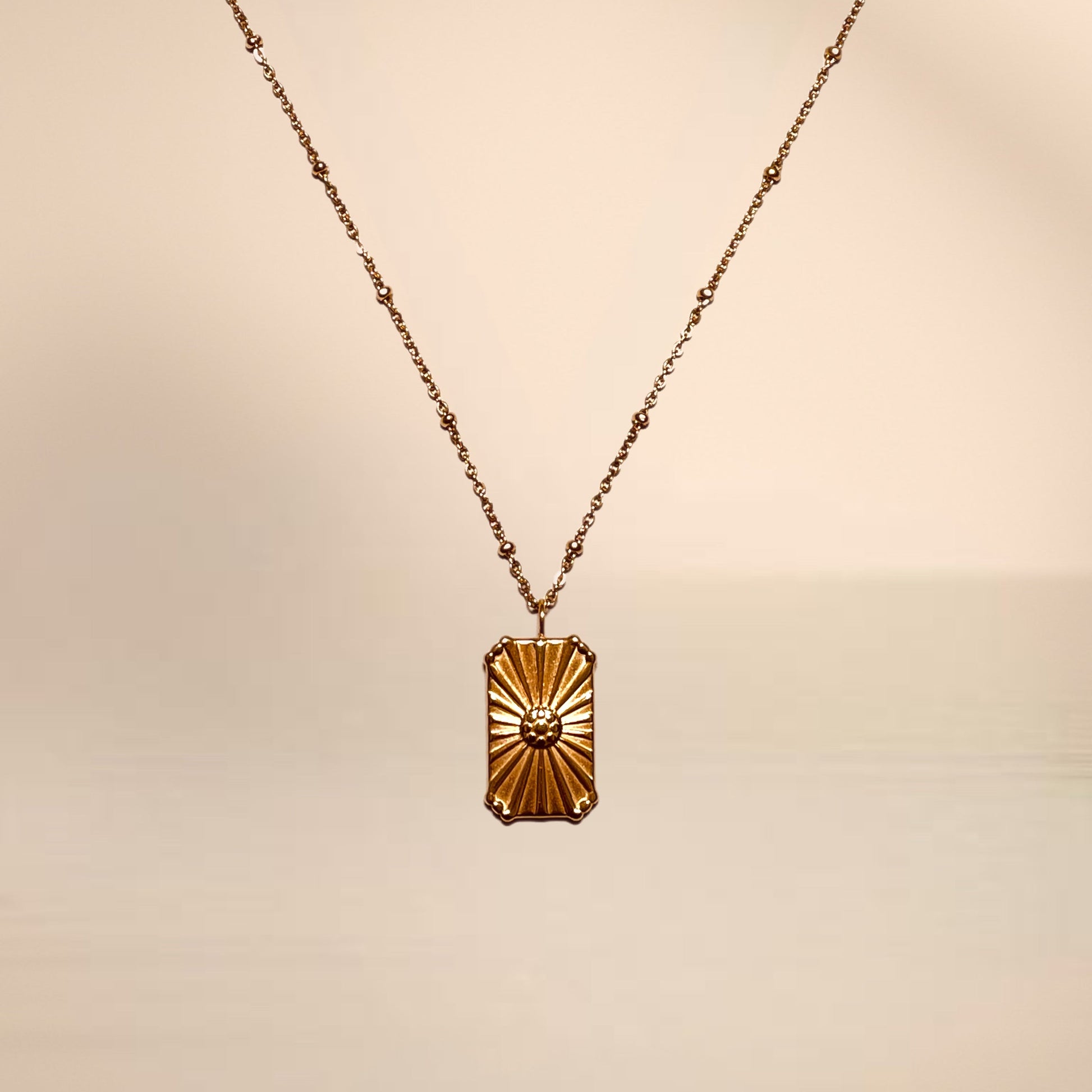 長方形吊墜上刻劃放射花紋,中央圓點如同太陽花心般綻放光芒。