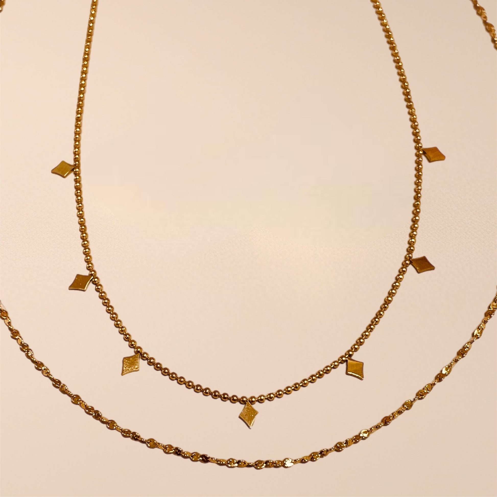 雙層設計,一條點綴小方片,一條低調細鏈,簡單卻能讓日常多一點變化。