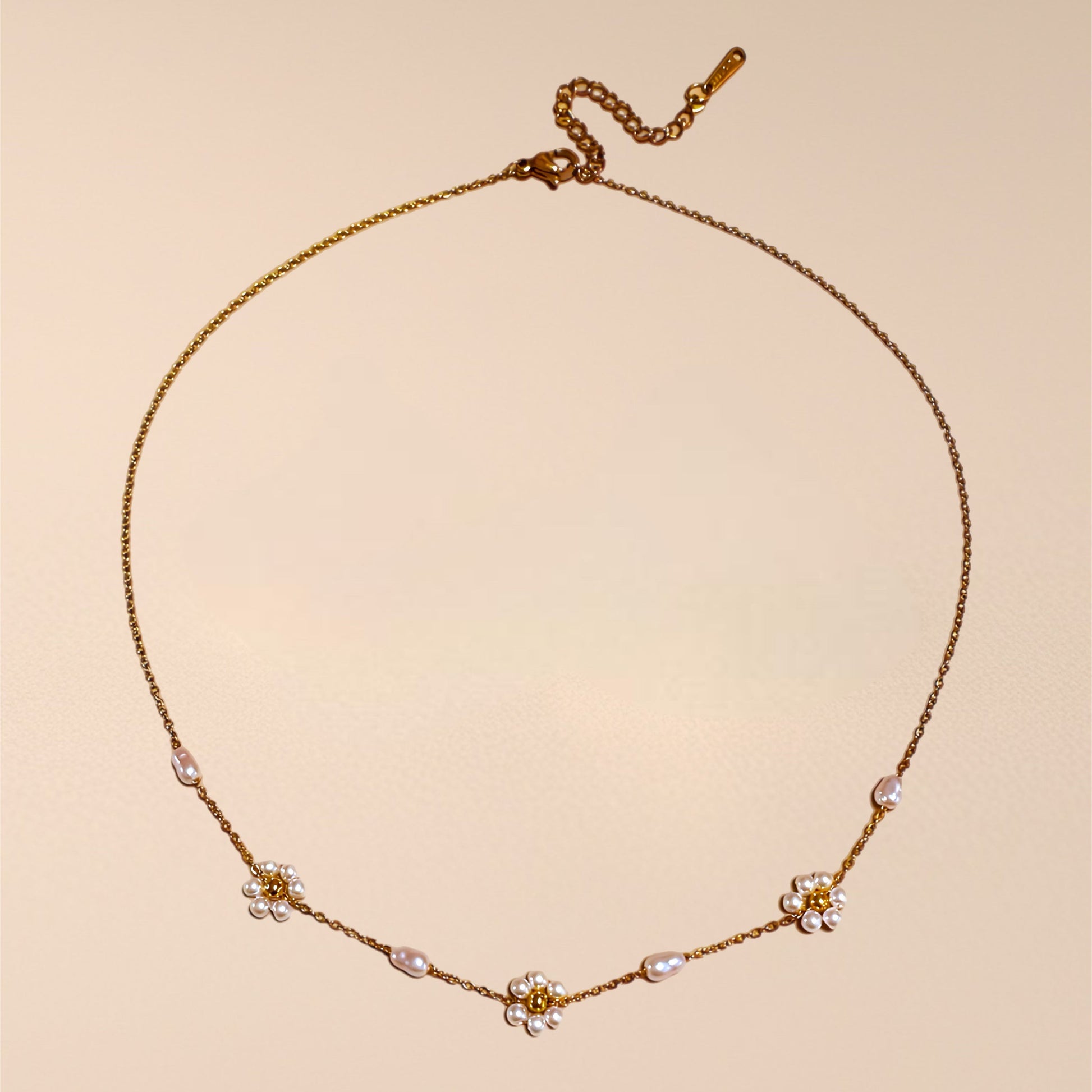 金色鍊條間隔白珠花朵與長形白珠,配色溫柔好搭。不鏽鋼鍍金材質,可碰水不易褪色,適合日常或度假穿搭。