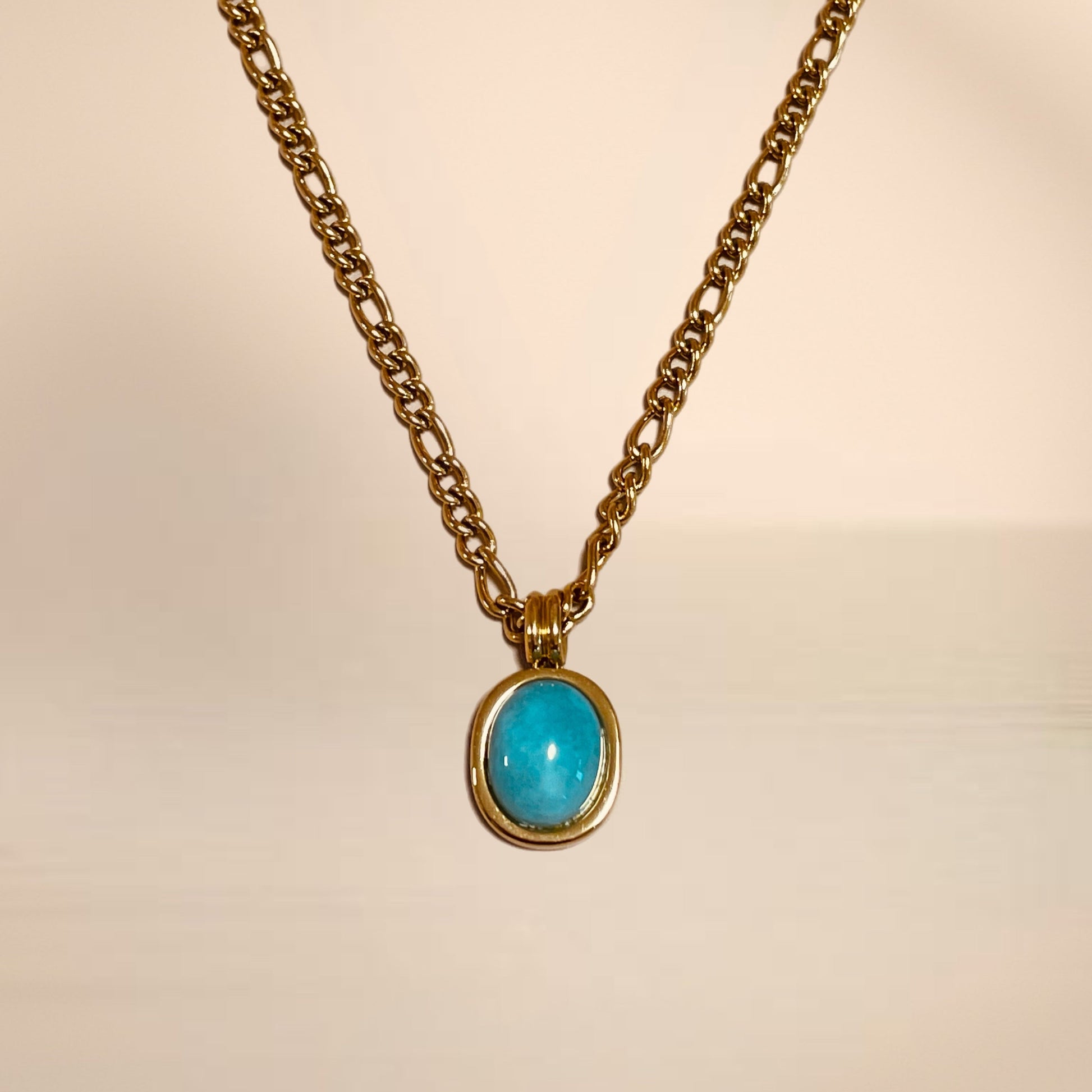 金色粗鍊搭配天河石吊墜,色澤清爽如海水,帶有自然礦石的獨特色感。不鏽鋼鍍金材質,可碰水不易褪色。