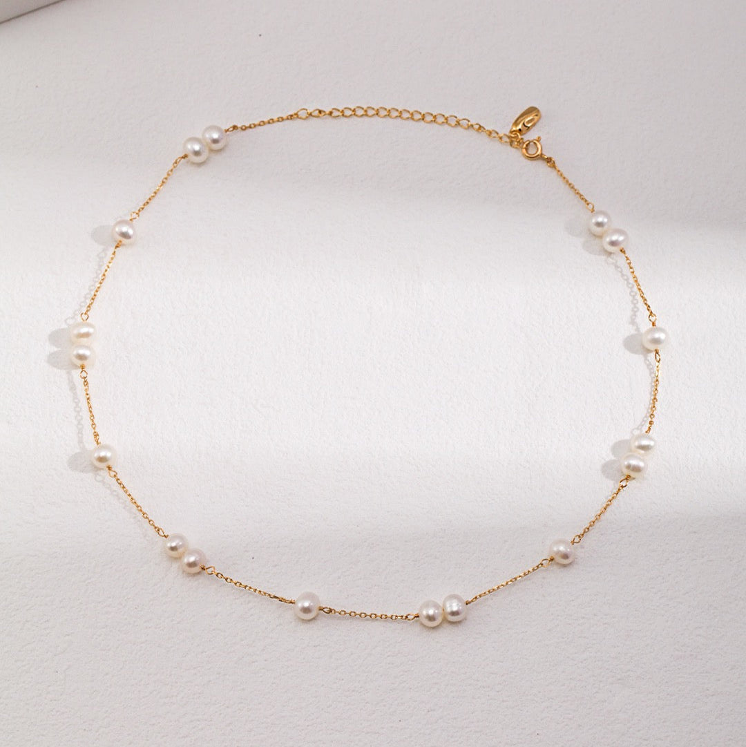 925純銀鍍金配件,細鍊間隔單顆與雙顆天然淡水珍珠,不管是單獨配戴或與其他項鍊疊戴都好搭。珍珠保留天然生成的形狀與光澤,每條項鍊皆獨一無二。